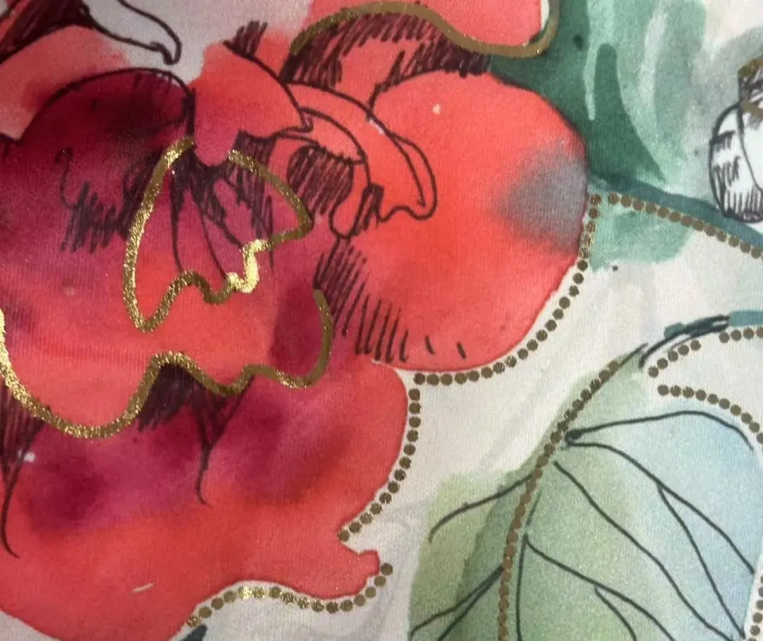 Heat transfer printing: Through high-temperature pressing, the gold foil adheres firmly to the fabric, presenting a metallic luster.